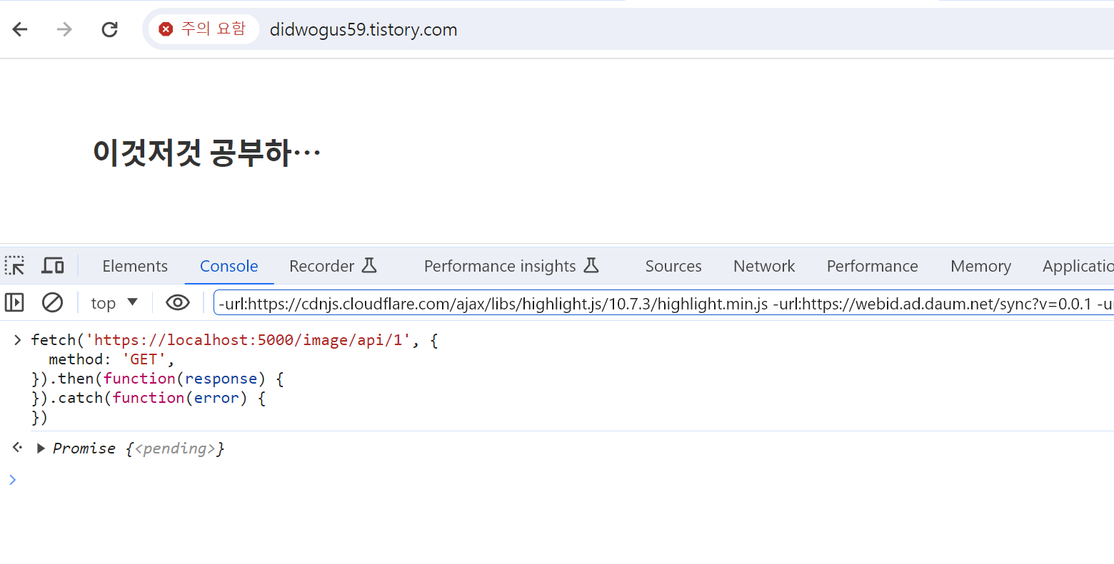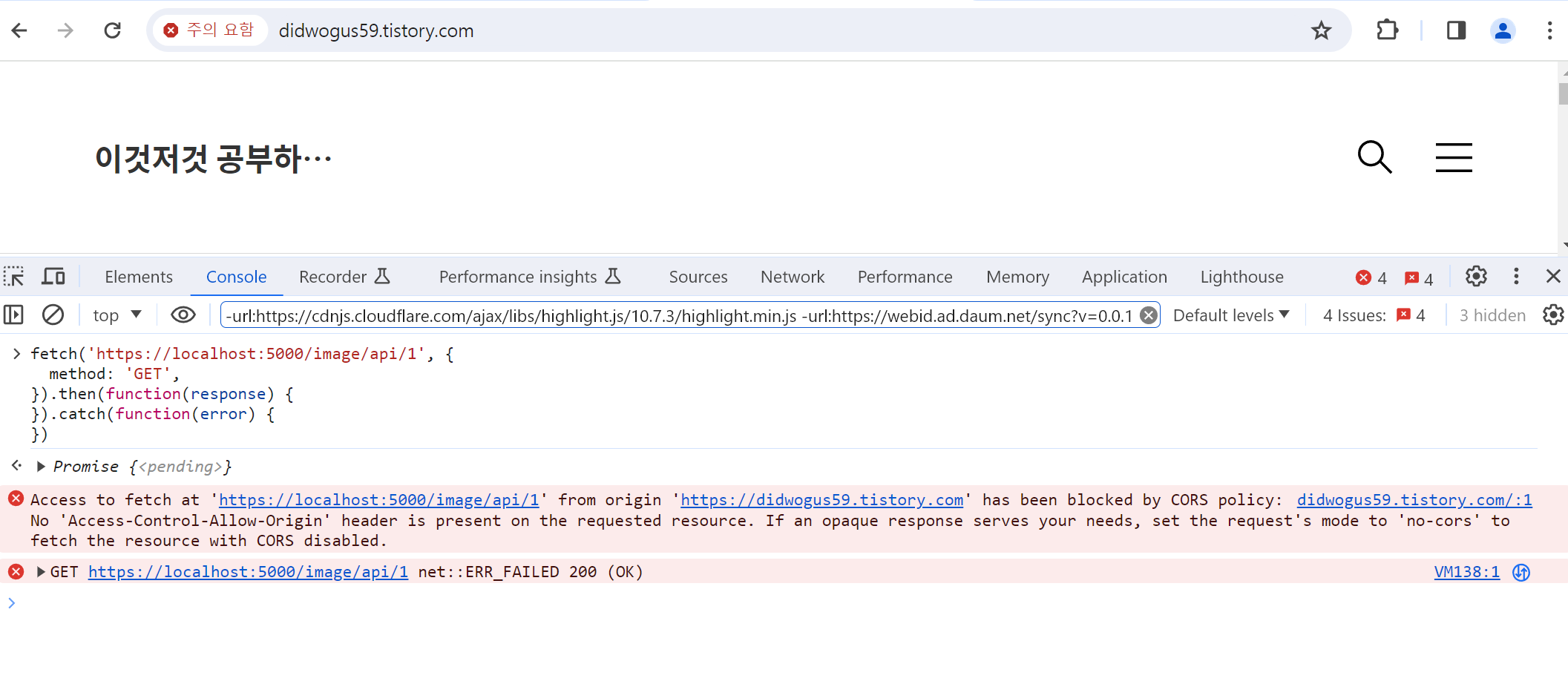다른 곳에서 요청을 보내니 CORS policy 때문에 blocked 됬다고 에러가 났다